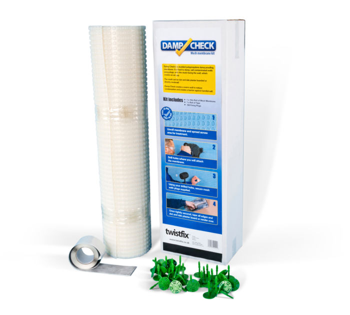The Twistfix Damp Check Mesh Membrane Kit contains everything required to create an effective, long-lasting barrier against moisture ingress when isolating damp walls from the internal finishes that surround them. Though most frequently used after a remedial damp proof course has been installed, the components of the mesh membrane kit can also be used to successfully block damp penetration and to waterproof wet rooms and showers.